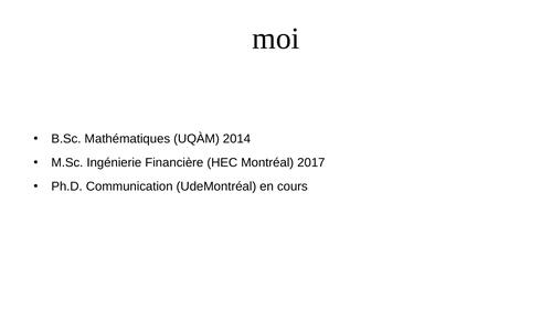Suite à des études en mathématiques, je complète une maîtrise en ingénierie financière en 2017, à HEC Montréal. Par la suite, j'occupe différents emplois dans des entreprises privées et dans des organismes à but non-lucratif tout en poursuivant ma pratique artistique.