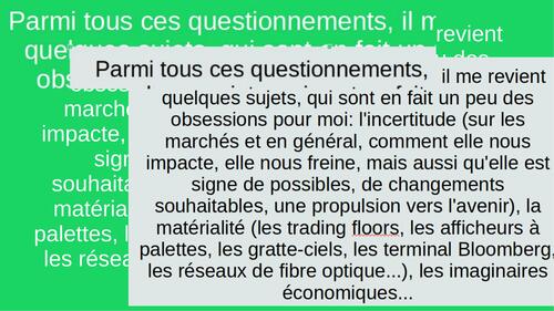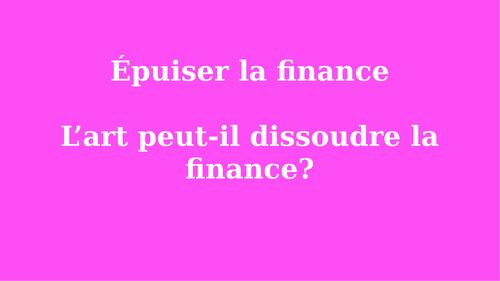 Je terminerai sur une ébauche des sujets animant mon doctorat, soit la question de l'épuisement de la finance - l'art peut-il dissoudre la finance ?