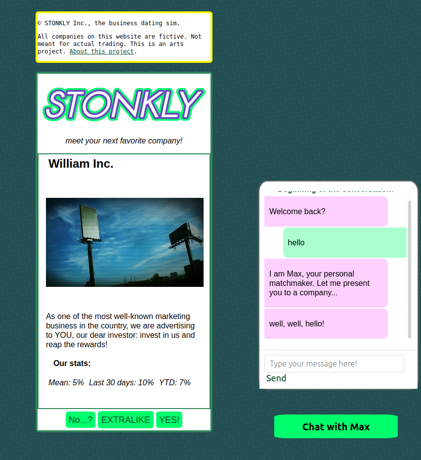 [2021] STONKLY, an interactive webapp simulating a business dating game.